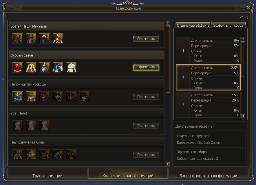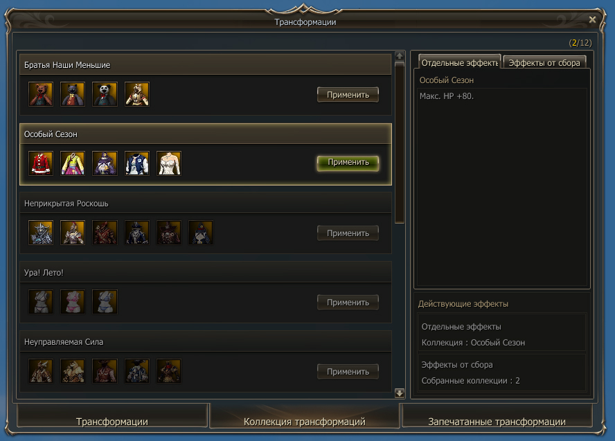 - When a collection effect is selected, it is displayed in the character's passive skills in a special block: "Transformation Collection Skills".