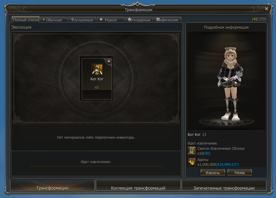 - To increase a card level, select the desired transformation from the list and press Evolution. In the opened window, add any transformation cards into the empty slots from the lower part of the window.