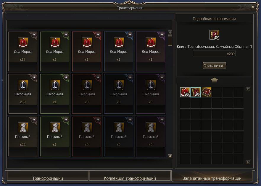 - After extraction, the character will receive a transformation book in the inventory depending on which transformation was extracted. For example, if an Enhanced-quality Santa Claus is extracted, the character will receive Transformation Book: Santa Claus - Enhanced, which allows learning exactly this type of this transformation.